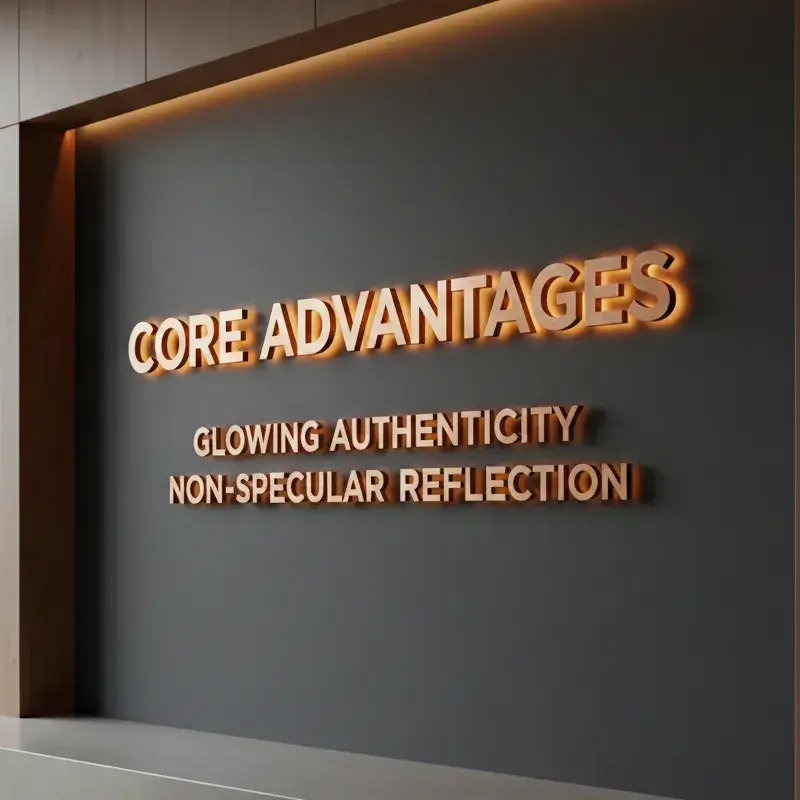 The plated finish enhances material depth while the back lighting adds separation without direct glare, making this style suitable for luxury retail signage, hospitality branding, and interior feature walls that demand a refined, material-focused presentation.